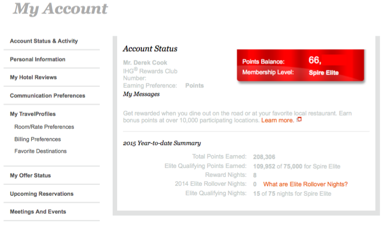 Here's the beauty of this: I only have IHG Spire Elite by virtue of holding the Chase IHG Rewards Club Select Credit Card. That card includes Platinum status but, when IHG rolled out Spire Elite earlier this year, it apparently counted the credit card signup bonus toward the point threshold for its new top elite level. So, for all intents and purposes, I have top elite status at two major hotel chains by carrying a single rewards credit card! While I stay in hotels a lot more than I fly, I can generally only qualify for elite status - aside from Hilton HHonors Silver - with only one chain. However, now that I have gotten into the points and miles community, I am only one stay at a Starwood property this month from having at last first level elite status at three chains. Not bad for someone who does not have a road warrior job!