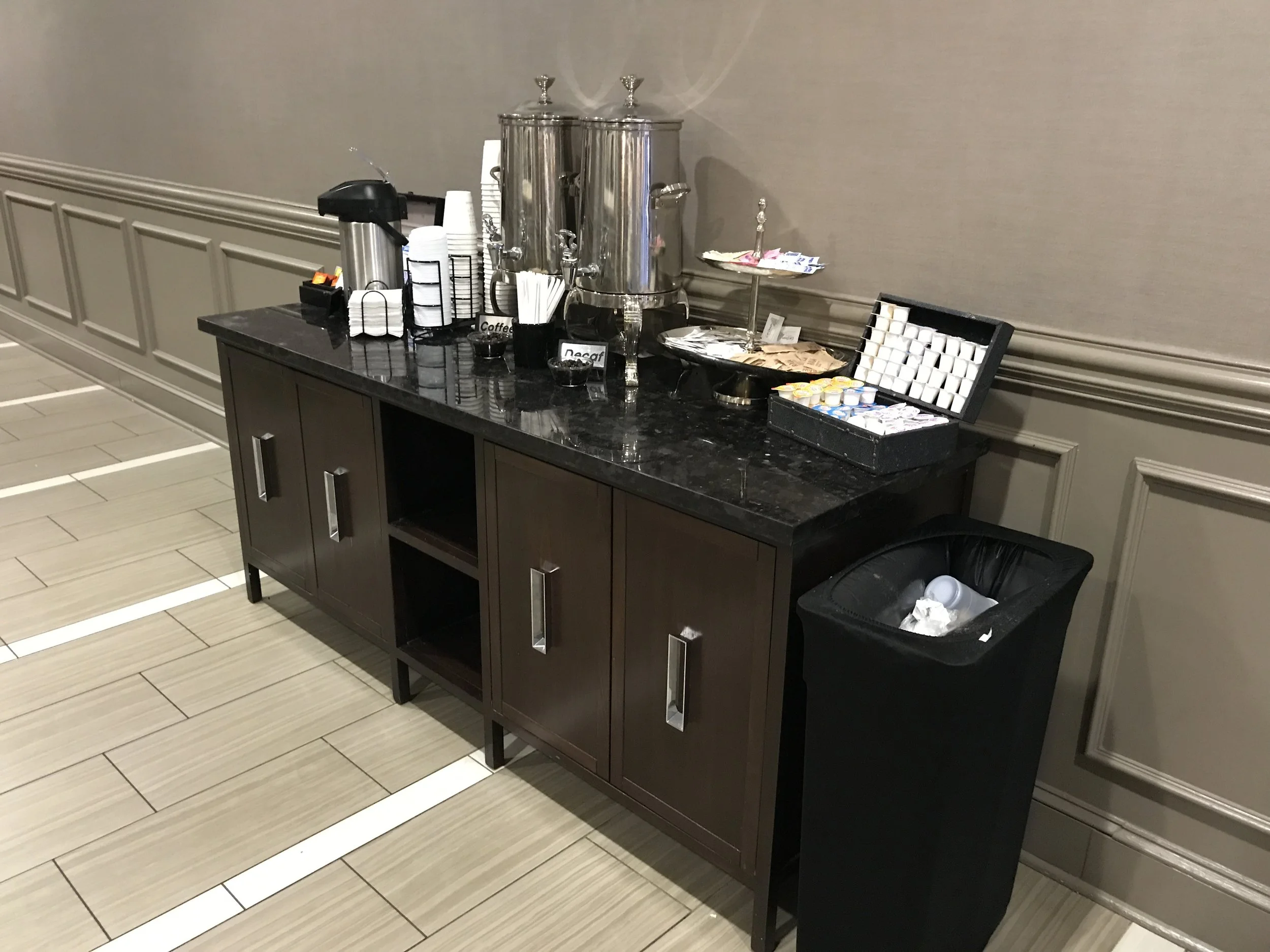 Due to the DoubleTree's brand positioning above hotels such as the Hampton Inn, these properties do not generally offer free breakfast but instead have in-house dining, including John Ryan's Bistro, John Ryan's Pub, and room service. However, we did not try any of these. In my opinion, if you are going to pay for breakfast, there are much better options in Savannah that are just a short walk away. A free coffee station was located in the hallway near the ground floor elevator lobby that was stocked all day.